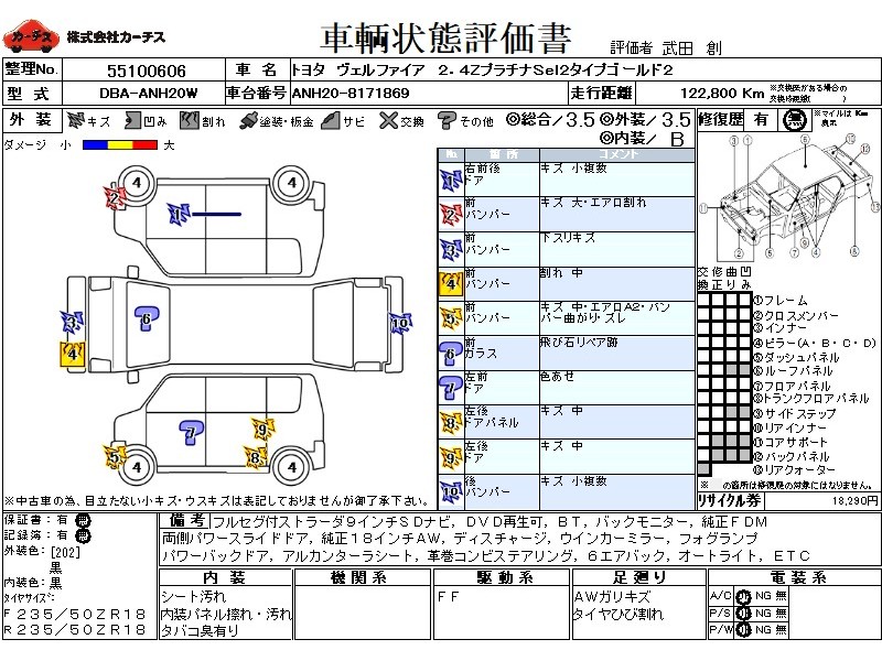 | メーカー・車種 | トヨタ ヴェルファイア 2.4ZプラチナSel2タイプゴールド2 (型式:DBA-ANH20W) | ||||||||||||||||||||||||||||||||||||||||