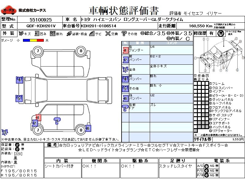 | メーカー・車種 | トヨタ ハイエースバン ロングスーパーGLダークプライム (型式:QDF-KDH201V) | ||||||||||||||||||||||||||||||||||||||||
