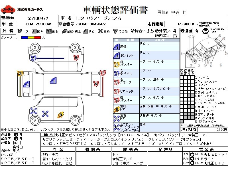 | メーカー・車種 | トヨタ ハリアー プレミアム (型式:DBA-ZSU60W) | ||||||||||||||||||||||||||||||||||||||||