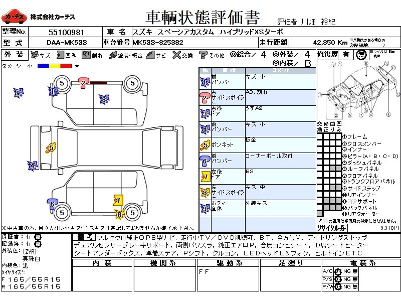 | メーカー・車種 | スズキ スペーシアカスタム ハイブリッドXSターボ (型式:DAA-MK53S) | ||||||||||||||||||||||||||||||||||||||||