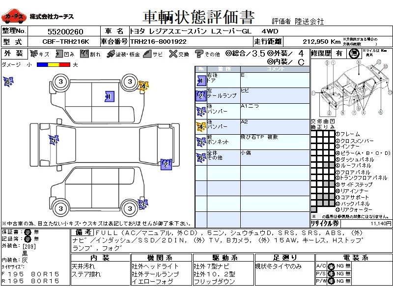 | メーカー・車種 | トヨタ レジアスエースバン LスーパーGL (型式:CBF-TRH216K) | ||||||||||||||||||||||||||||||||||||||||