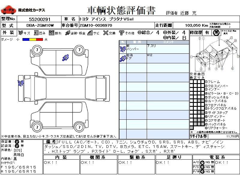 | メーカー・車種 | トヨタ アイシス プラタナVSel (型式:DBA-ZGM10W) | ||||||||||||||||||||||||||||||||||||||||
