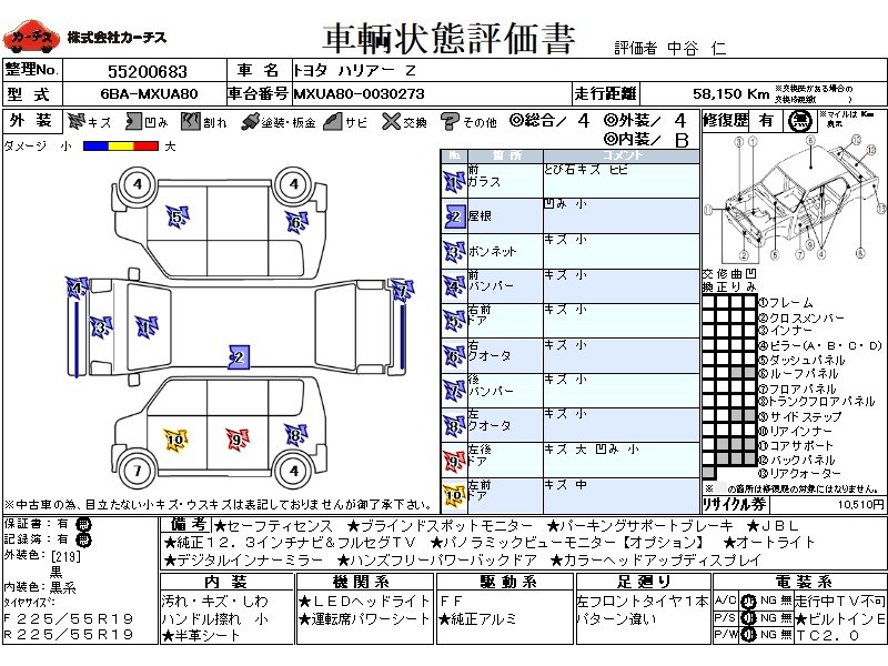 | メーカー・車種 | トヨタ ハリアー Z (型式:6BA-MXUA80) | ||||||||||||||||||||||||||||||||||||||||