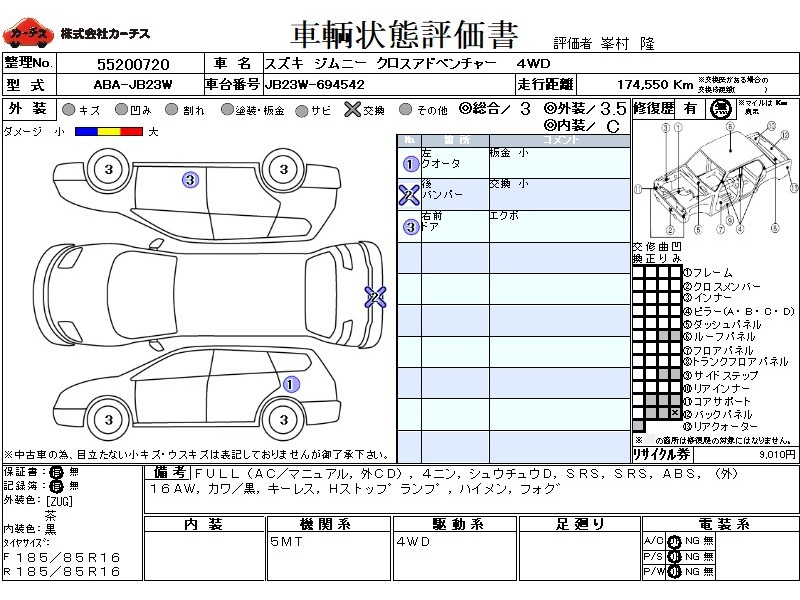 | メーカー・車種 | スズキ ジムニー クロスアドベンチャー (型式:ABA-JB23W) | ||||||||||||||||||||||||||||||||||||||||