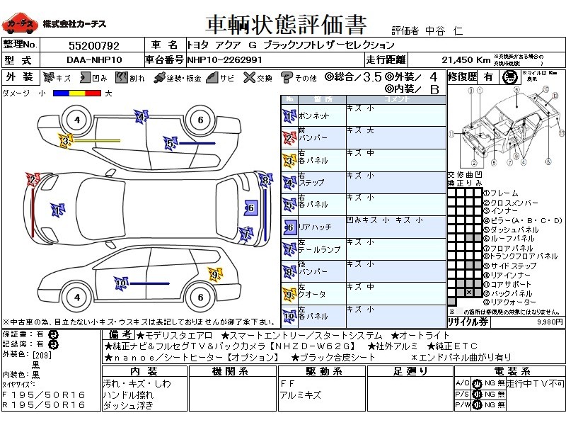 | メーカー・車種 | トヨタ アクア GブラックソフトレザーSel (型式:DAA-NHP10) | ||||||||||||||||||||||||||||||||||||||||