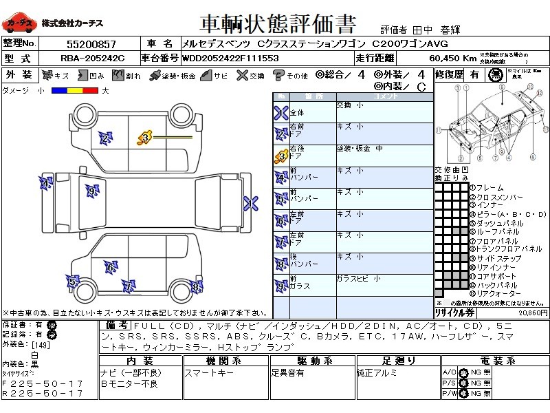 | メーカー・車種 | メルセデスベンツ Cクラスステーションワゴン C200ワゴンAVG (型式:RBA-205242C) | ||||||||||||||||||||||||||||||||||||||||