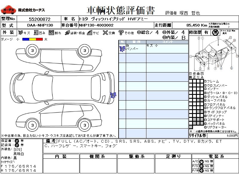 | メーカー・車種 | トヨタ ヴィッツハイブリッド HVFアミー (型式:DAA-NHP130) | ||||||||||||||||||||||||||||||||||||||||