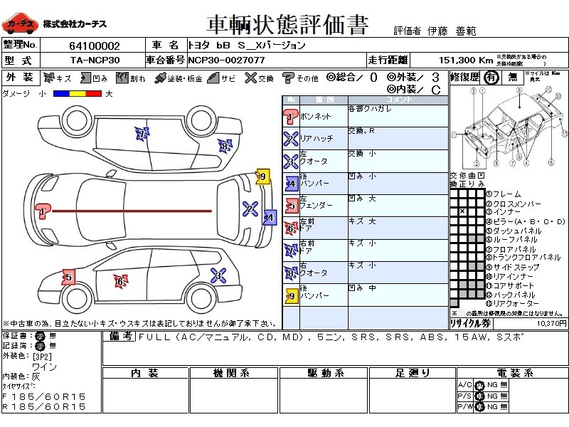 | メーカー・車種 | トヨタ bB S_Xバージョン (型式:TA-NCP30) | ||||||||||||||||||||||||||||||||||||||||