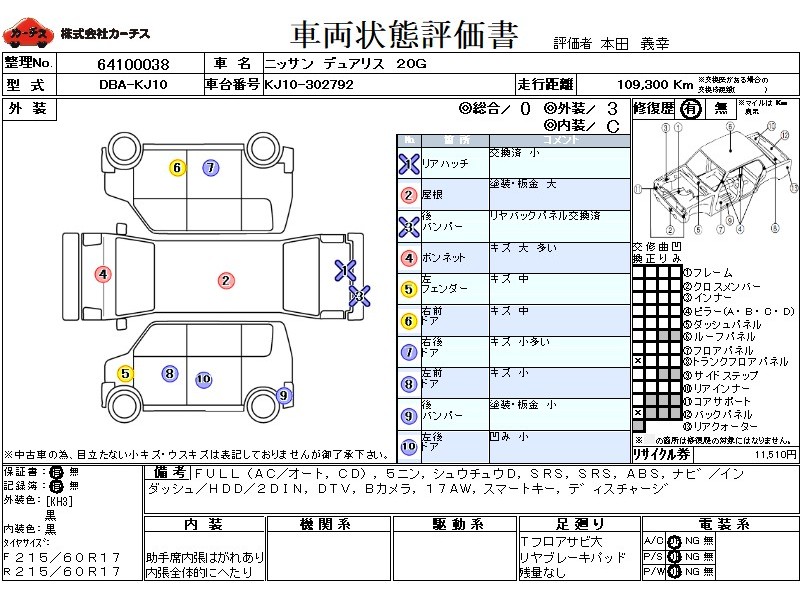 | メーカー・車種 | 日産 デュアリス 20G (型式:DBA-KJ10) | ||||||||||||||||||||||||||||||||||||||||
