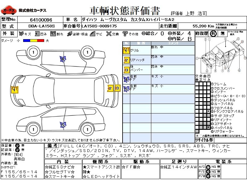 | メーカー・車種 | ダイハツ ムーヴカスタム カスタムXハイパーSA2 (型式:DBA-LA150S) | ||||||||||||||||||||||||||||||||||||||||