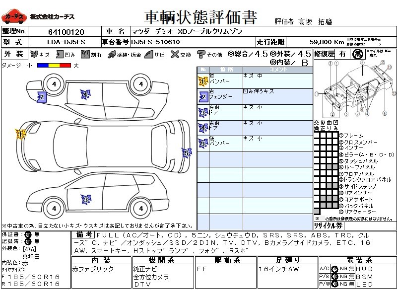 | メーカー・車種 | マツダ デミオ XDノーブルクリムゾン (型式:LDA-DJ5FS) | ||||||||||||||||||||||||||||||||||||||||