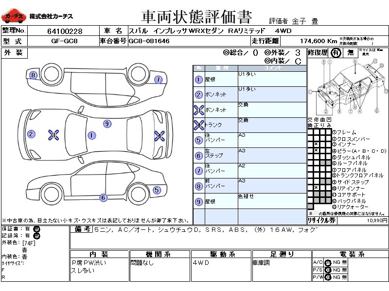 | メーカー・車種 | スバル インプレッサWRXセダン RAリミテッド (型式:GF-GC8) | ||||||||||||||||||||||||||||||||||||||||
