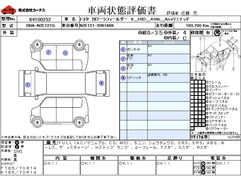 | メーカー・車種 | トヨタ カローラフィールダー X_HID_40th_Anvリミテッド (型式:DBA-NZE121G) | ||||||||||||||||||||||||||||||||||||||||