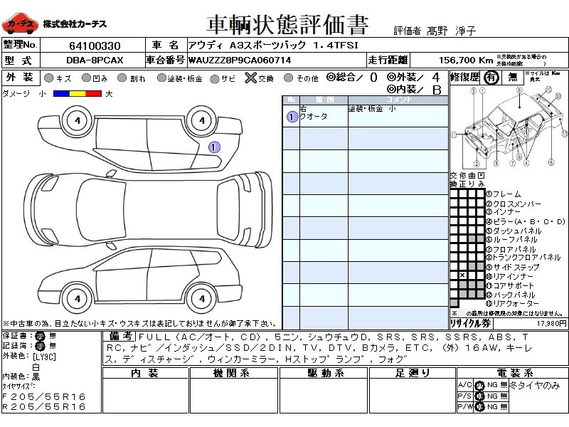 | メーカー・車種 | アウディ A3スポーツバック 1.4TFSI (型式:DBA-8PCAX) | ||||||||||||||||||||||||||||||||||||||||