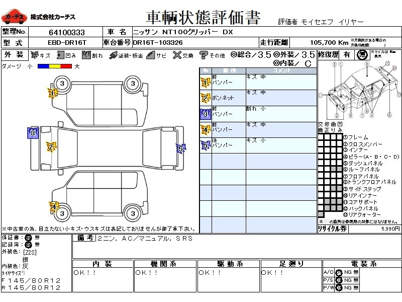 | メーカー・車種 | 日産 NT100クリッパー DX (型式:EBD-DR16T) | ||||||||||||||||||||||||||||||||||||||||