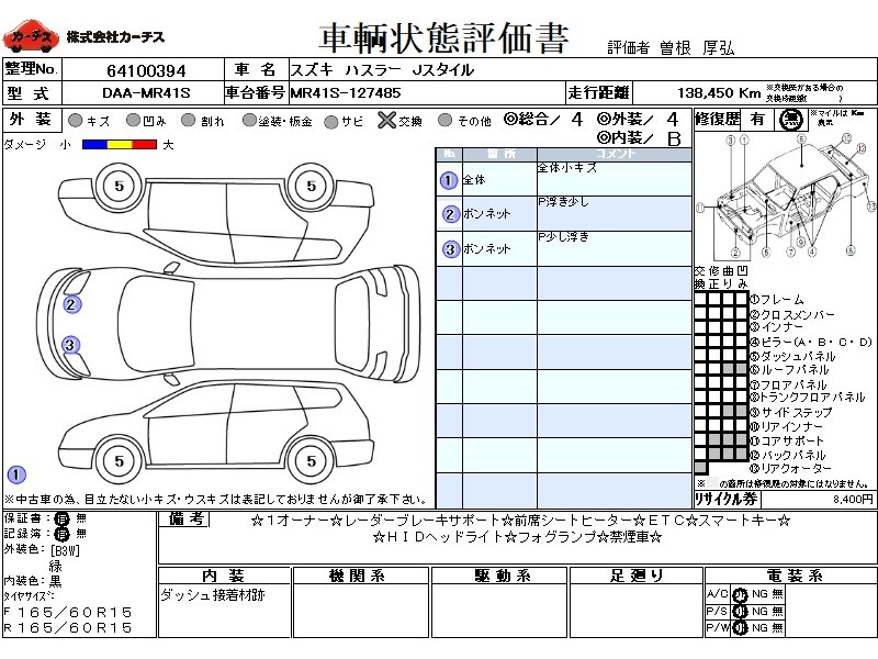 | メーカー・車種 | スズキ ハスラー Jスタイル (型式:DAA-MR41S) | ||||||||||||||||||||||||||||||||||||||||