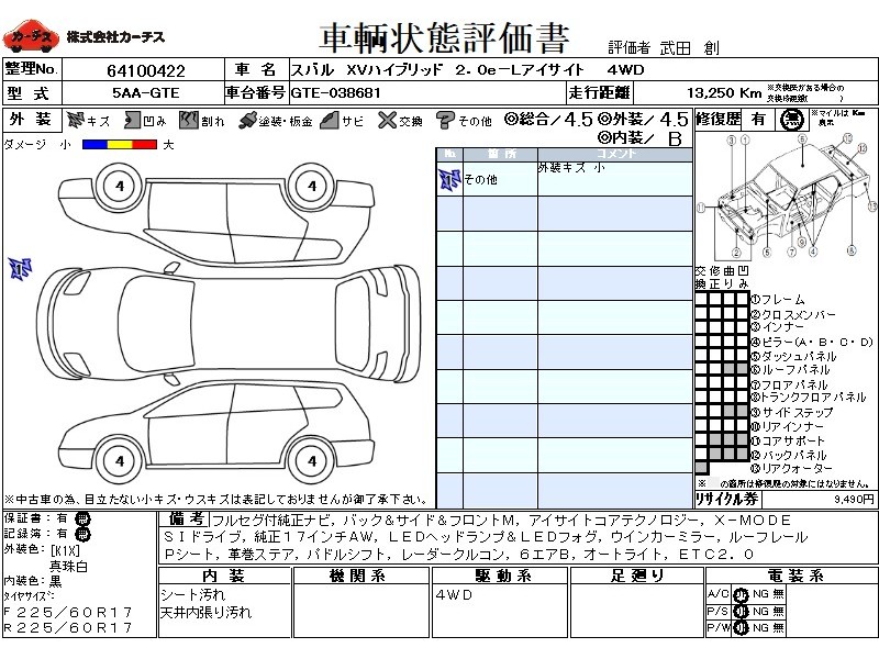 | メーカー・車種 | スバル XVハイブリッド 2.0e-Lアイサイト (型式:5AA-GTE) | ||||||||||||||||||||||||||||||||||||||||