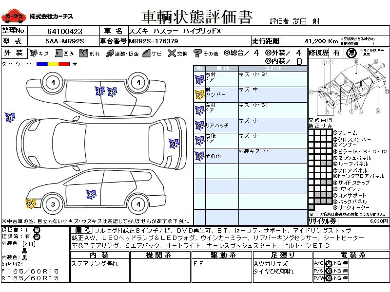 | メーカー・車種 | スズキ ハスラー ハイブリッドX (型式:5AA-MR92S) | ||||||||||||||||||||||||||||||||||||||||