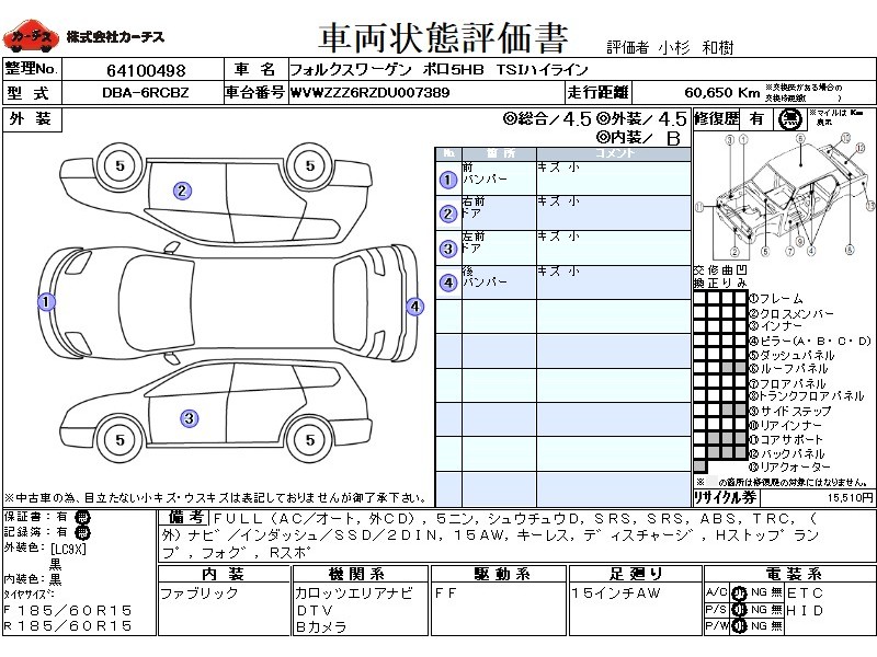 | メーカー・車種 | フォルクスワーゲン ポロ5HB TSIハイライン (型式:DBA-6RCBZ) | ||||||||||||||||||||||||||||||||||||||||