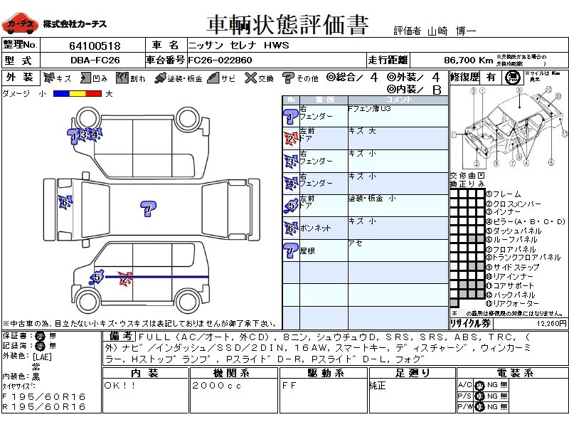 | メーカー・車種 | 日産 セレナ HWS (型式:DBA-FC26) | ||||||||||||||||||||||||||||||||||||||||