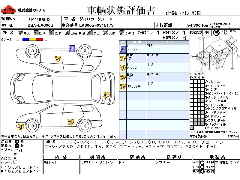 | メーカー・車種 | ダイハツ タント X (型式:DBA-LA600S) | ||||||||||||||||||||||||||||||||||||||||