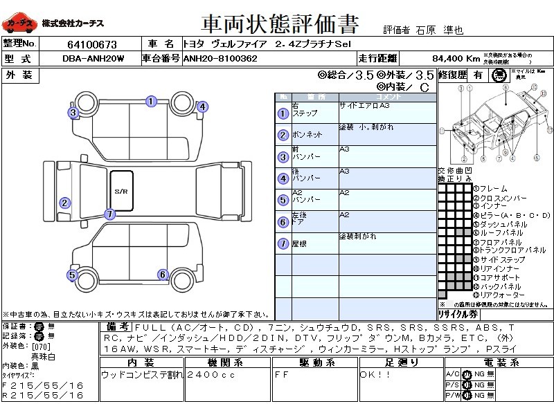 | メーカー・車種 | トヨタ ヴェルファイア 2.4ZプラチナSel (型式:DBA-ANH20W) | ||||||||||||||||||||||||||||||||||||||||