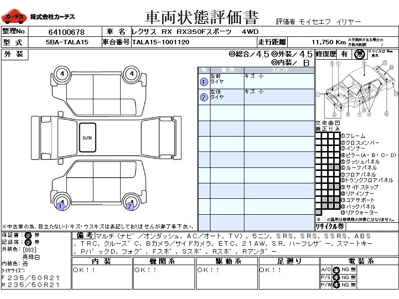 | メーカー・車種 | レクサス RX RX350Fスポーツ (型式:5BA-TALA15) | ||||||||||||||||||||||||||||||||||||||||