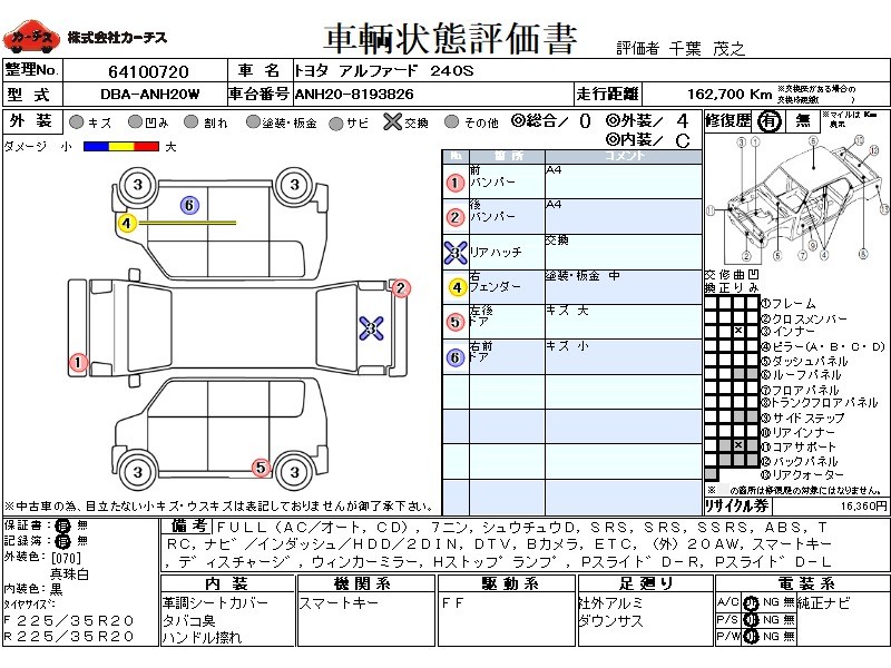 | メーカー・車種 | トヨタ アルファード 240S (型式:DBA-ANH20W) | ||||||||||||||||||||||||||||||||||||||||