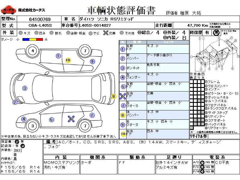 | メーカー・車種 | ダイハツ ソニカ RSリミテッド (型式:CBA-L405S) | ||||||||||||||||||||||||||||||||||||||||