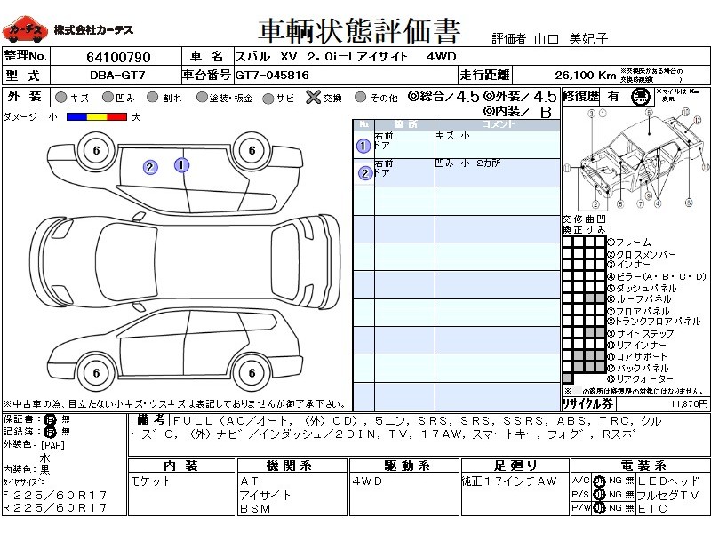 | メーカー・車種 | スバル XV 2.0i-Lアイサイト (型式:DBA-GT7) | ||||||||||||||||||||||||||||||||||||||||