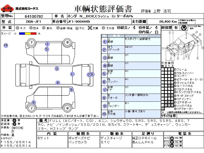 | メーカー・車種 | ホンダ N BOXスラッシュ G・ターボAPk (型式:DBA-JF1) | ||||||||||||||||||||||||||||||||||||||||