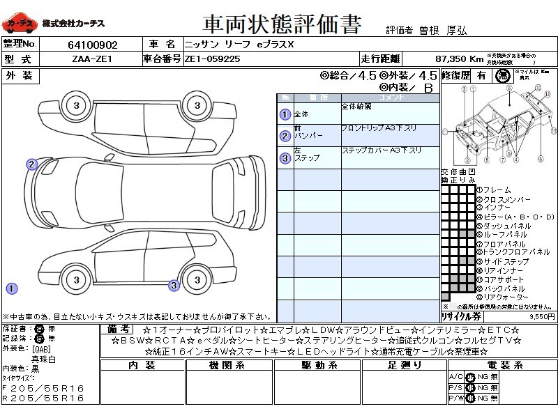 | メーカー・車種 | 日産 リーフ eプラスX (型式:ZAA-ZE1) | ||||||||||||||||||||||||||||||||||||||||