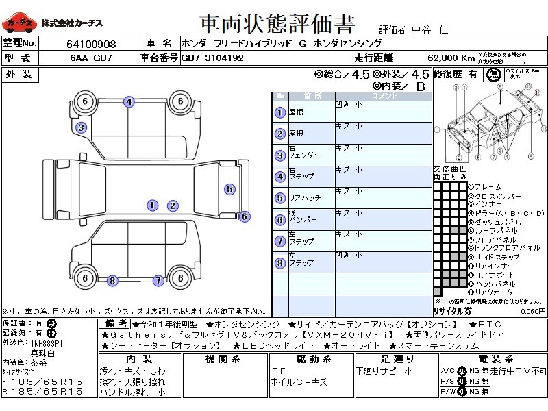 | メーカー・車種 | ホンダ フリードハイブリッド ハイブリッドGホンダセンシング (型式:6AA-GB7) | ||||||||||||||||||||||||||||||||||||||||