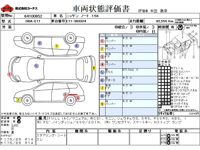 | メーカー・車種 | 日産 ノート 15X (型式:DBA-E11) | ||||||||||||||||||||||||||||||||||||||||