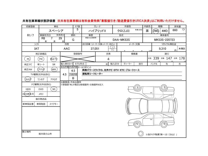 | メーカー・車種 | スズキ スペーシア ハイブリッドX (型式:DAA-MK53S) | ||||||||||||||||||||||||||||||||||||||||