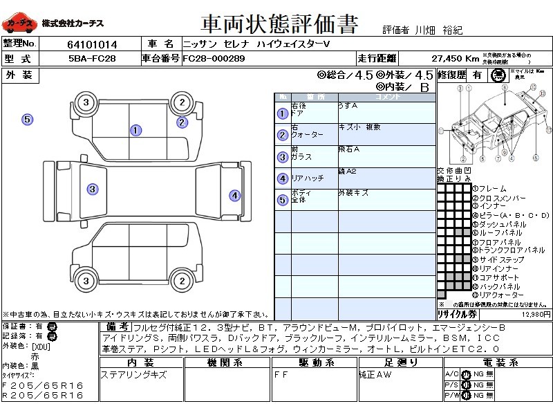 | メーカー・車種 | 日産 セレナ ハイウェイスターV (型式:5BA-FC28) | ||||||||||||||||||||||||||||||||||||||||