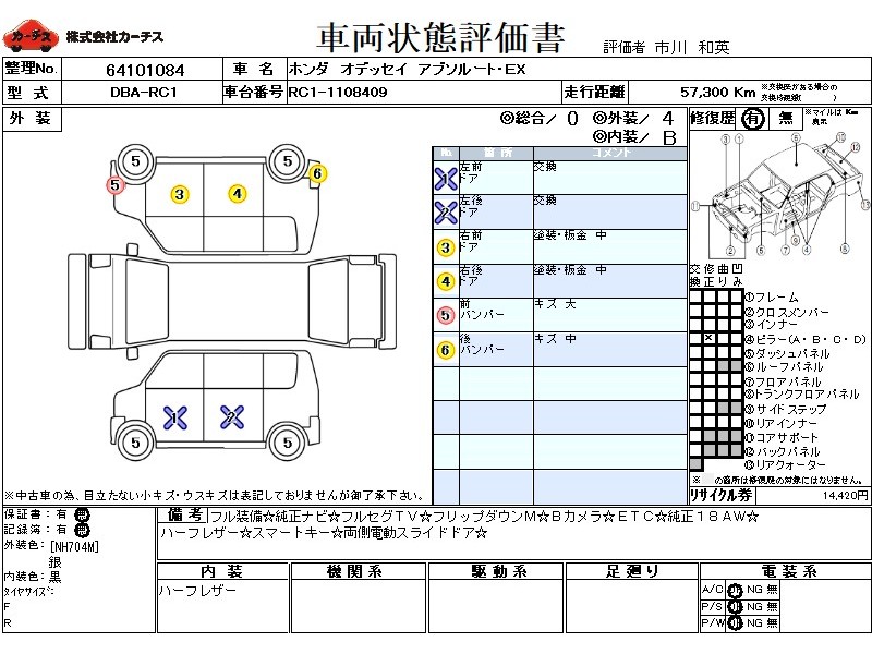 | メーカー・車種 | ホンダ オデッセイ アブソルート・EX (型式:DBA-RC1) | ||||||||||||||||||||||||||||||||||||||||