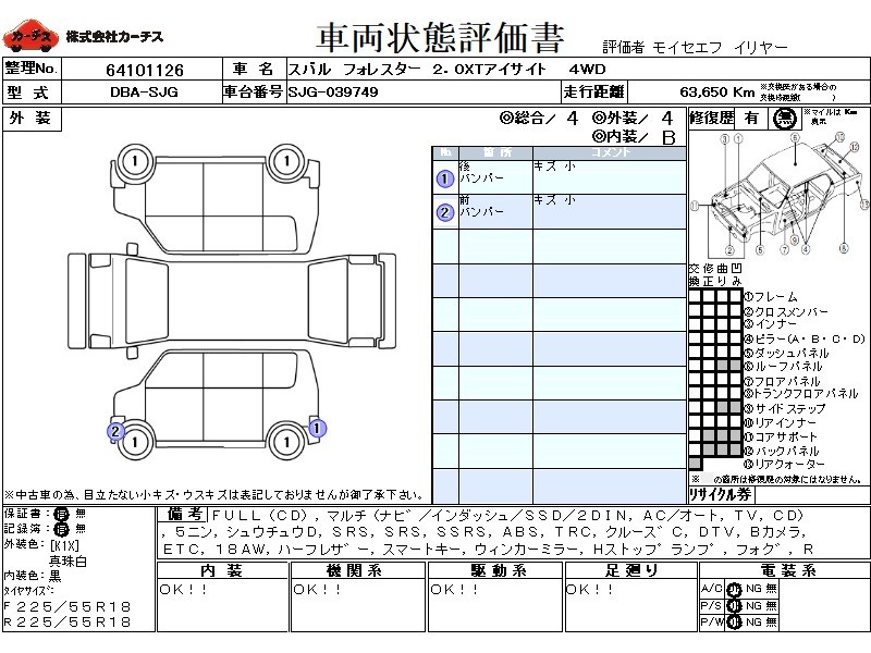 | メーカー・車種 | スバル フォレスター 2.0XTアイサイト (型式:DBA-SJG) | ||||||||||||||||||||||||||||||||||||||||