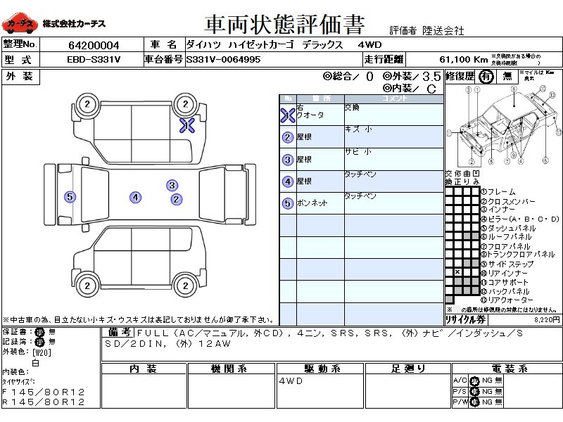 | メーカー・車種 | ダイハツ ハイゼットカーゴ デラックス (型式:EBD-S331V) | ||||||||||||||||||||||||||||||||||||||||
