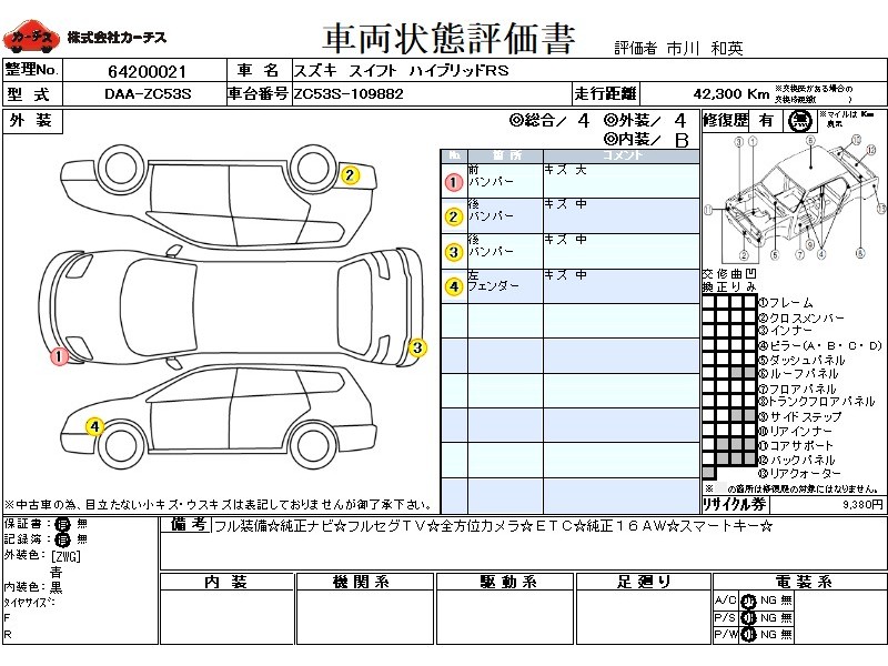 | メーカー・車種 | スズキ スイフト ハイブリッドRS (型式:DAA-ZC53S) | ||||||||||||||||||||||||||||||||||||||||
