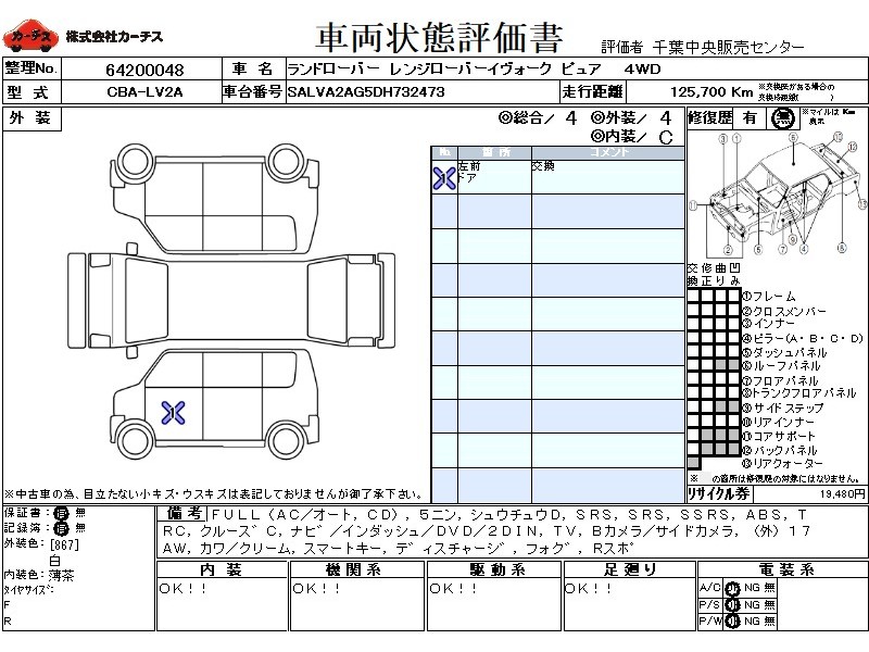 | メーカー・車種 | ランドローバー レンジローバーイヴォーク ピュア (型式:CBA-LV2A) | ||||||||||||||||||||||||||||||||||||||||