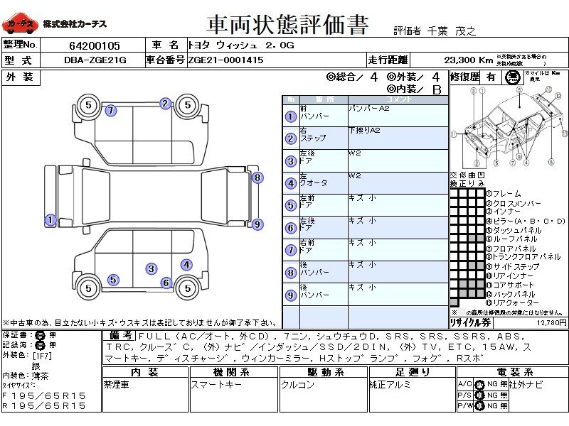 | メーカー・車種 | トヨタ ウィッシュ 2.0G (型式:DBA-ZGE21G) | ||||||||||||||||||||||||||||||||||||||||