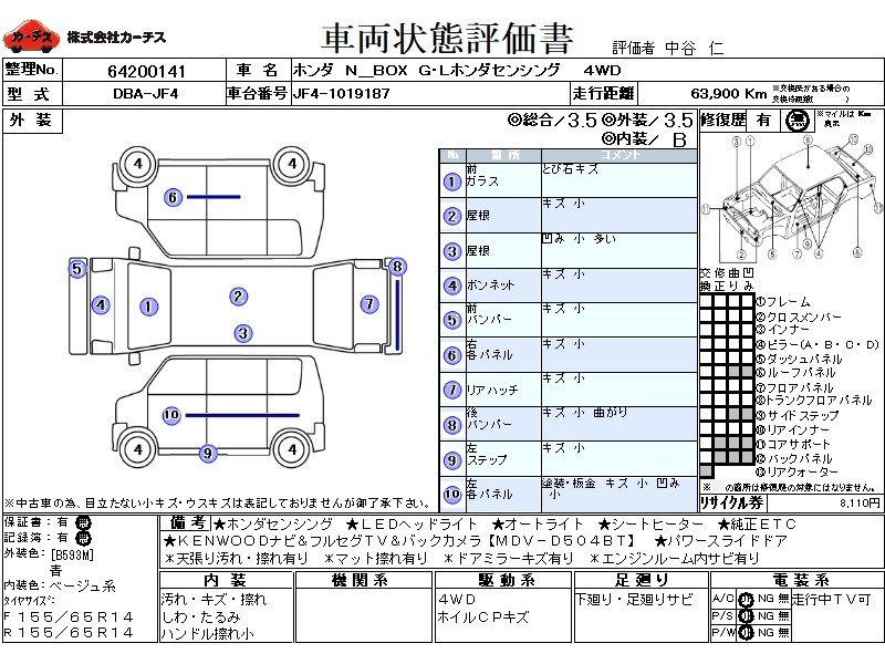 | メーカー・車種 | ホンダ N BOX G・Lホンダセンシング (型式:DBA-JF4) | ||||||||||||||||||||||||||||||||||||||||