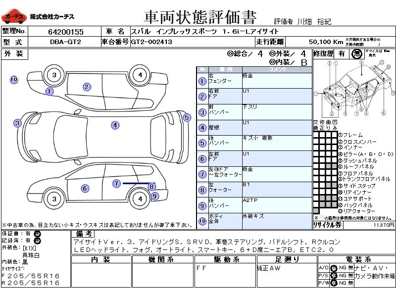 | メーカー・車種 | スバル インプレッサスポーツ 1.6i-Lアイサイト (型式:DBA-GT2) | ||||||||||||||||||||||||||||||||||||||||