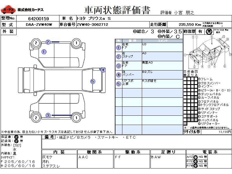 | メーカー・車種 | トヨタ プリウスa S (型式:DAA-ZVW40W) | ||||||||||||||||||||||||||||||||||||||||