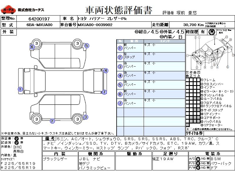 | メーカー・車種 | トヨタ ハリアー ZレザーPk (型式:6BA-MXUA80) | ||||||||||||||||||||||||||||||||||||||||