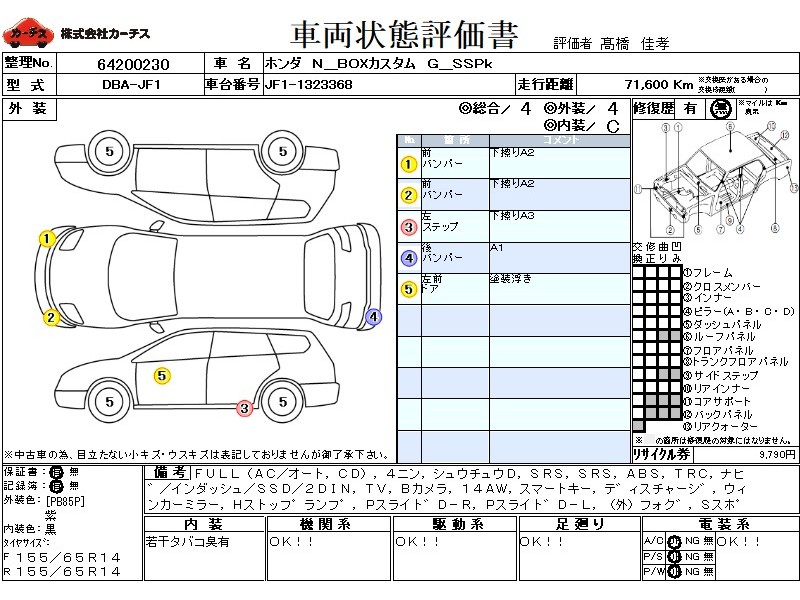 | メーカー・車種 | ホンダ N BOXカスタム G_SSPk (型式:DBA-JF1) | ||||||||||||||||||||||||||||||||||||||||