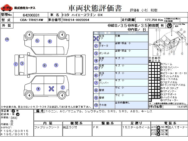 | メーカー・車種 | トヨタ ハイエースワゴン DX (型式:CBA-TRH214W) | ||||||||||||||||||||||||||||||||||||||||