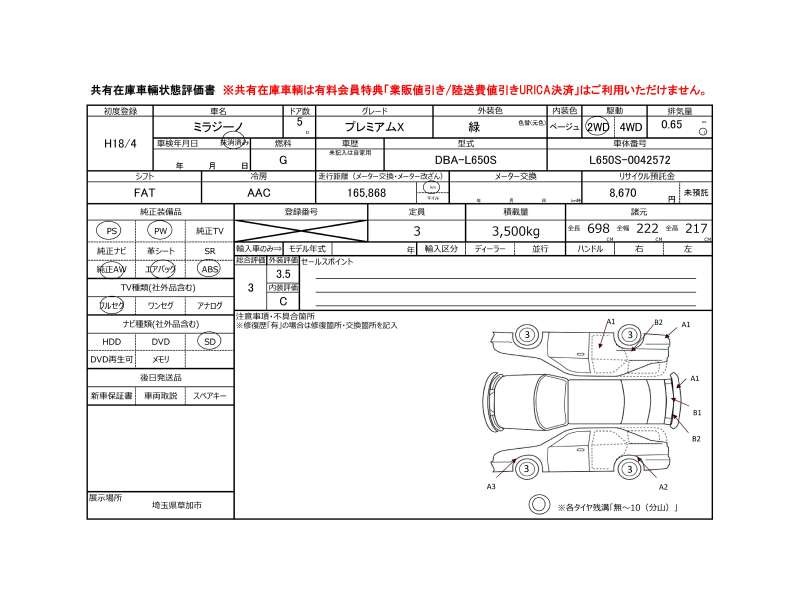 | メーカー・車種 | ダイハツ ミラジーノ5D プレミアムX (型式:DBA-L650S) | ||||||||||||||||||||||||||||||||||||||||