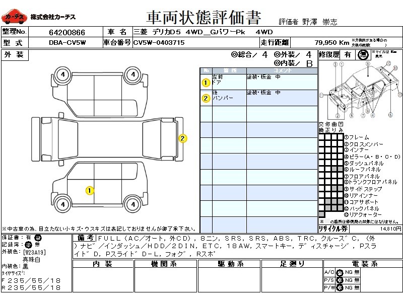 | メーカー・車種 | 三菱 デリカD5 4WD_GパワーPk (型式:DBA-CV5W) | ||||||||||||||||||||||||||||||||||||||||